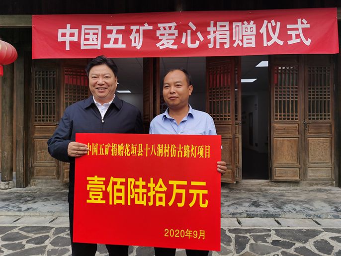 在十八洞村村委会前,陪同调研的花垣县委书记罗明主持了捐赠仪式。仪式上,国文清代表集团公司向十八洞村捐赠160万元,用于援建十八洞村的苗寨照明工程和腊肉扶贫车间工程。国文清在仪式上说,2013年习近平总书记来到十八洞村,总书记对乡亲们亲切关怀的电视画面至今还历历在目。几年来,十八洞村的干部群众感谢总书记关怀、听总书记话,十八洞村发生了翻天覆地的变化。作为中央企业定点扶贫单位,我们打心底里高兴。国文清指出,我们来十八洞村调研脱贫攻坚,就是要带着诚意来、奔着问题去。中国五矿在花垣县梳子山村已经援建了一个年产10万斤、产值600余万元的腊制品扶贫车间,发挥了很好的示范带动作用。这次十八洞村希望将这一模式复制过来,我们充分支持,希望十八洞村村委会把项目务实的规划好,把资金用好、项目建设好,为十八洞村村民打造一个增收带动力强、长富久安的好项目。同时把照明工程建设好,使用环保、耐用的节能灯,把古寨的民生条件改善好,为古寨百姓和游客创造安全便利条件。