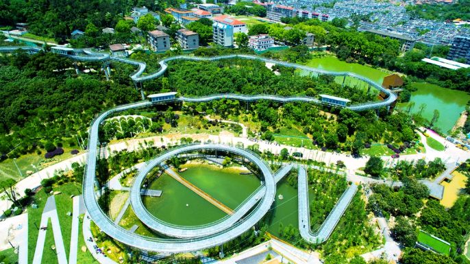 福建福州“福道”于2017年底建成,很多人看到“福道”第一眼的感受是惊艳,悬空栈道,感觉像是行走在森林顶端,整个步道的坡度8°,走起来不会太累,轮椅也可以通行。福道“镂空”设计能最大限度地保护山体的原生态,底下的植被可以充分吸收阳光和雨水,体现了“生态”的理念。环形悬空栈道只是福道一部分,整条福道长约19公里,横贯象山、后县山、梅峰山、金牛山等山体脊,贯穿福州五大公园。为确保游客能快速便捷往返,福道着重将悬空栈道、登山步道和车行道,对接形成环形系统。对于离不开网络的现代人来说,福道配有WIFI连接,触屏信息板和游客交通监察器,可谓是名副其实的智能步道。福道建成以来,先后获得了“国际建筑奖”、“新加坡总统设计奖”、“全国冶金行业优质工程奖项”和“第十三届中国钢结构金奖”。