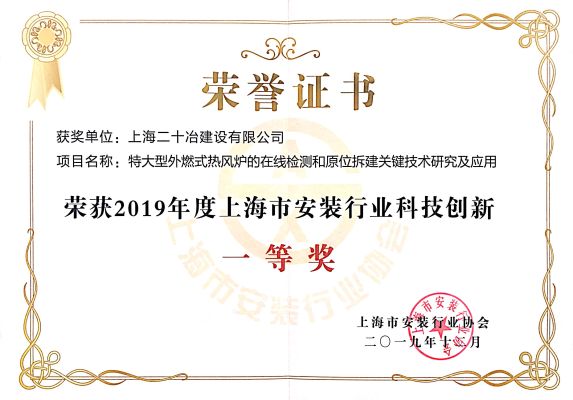 3月26日,上海市安装行业协会颁发了2019年度上海市安装行业科技创新获奖证书,中国二十冶集团自主研发的“特大型外燃式热风炉的在线检测和原位拆建关键技术研究及应用”荣获一等奖,另一项成果“复杂环境下厚板轧机的在线升级改造施工关键技术研究与应用”获三等奖。