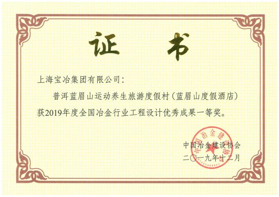 近日,中国冶金建设行业协会公布了2019年冶金建设行业工程设计优秀名单。由上海宝冶设计的“普洱蓝眉山运动养生旅游度假村”、“罗店大型居住社区经济适用房二期项目”分别荣获工程设计优秀成果一等奖和二等奖。