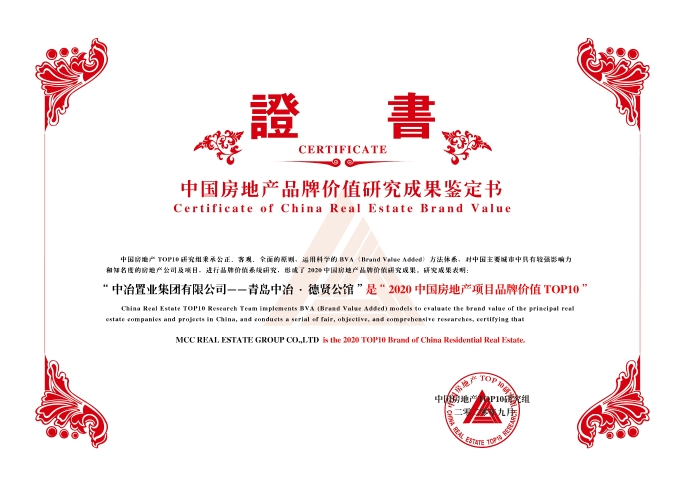 青岛中冶·德贤公馆项目荣获“2020中国房地产项目品牌价值TOP10”称号